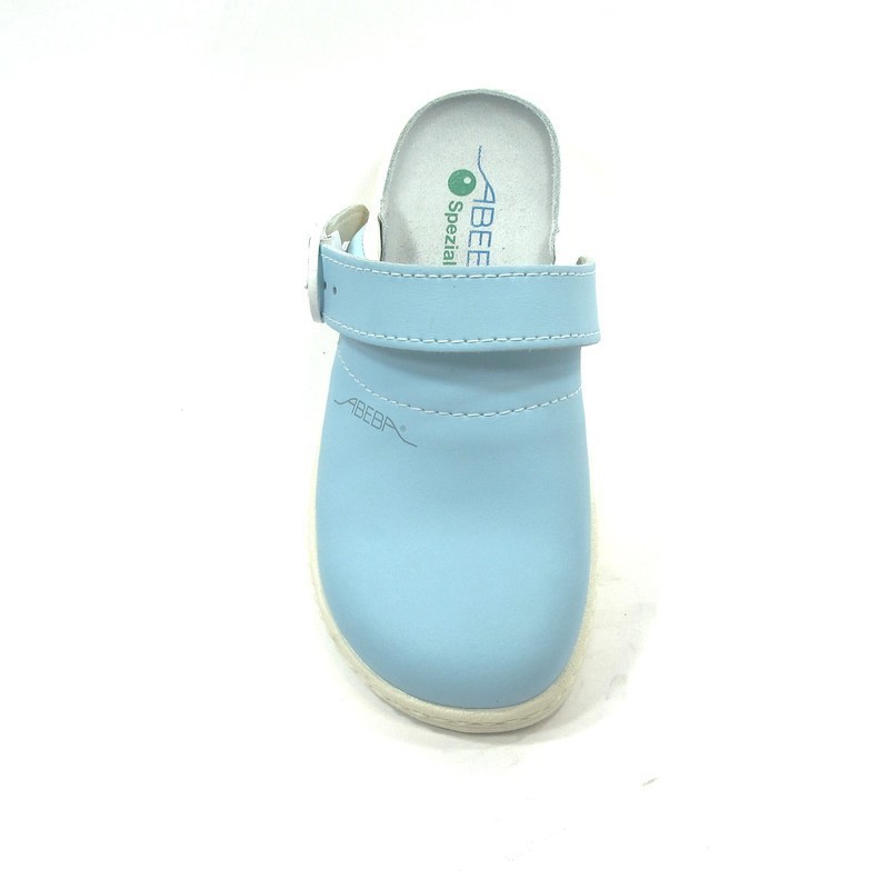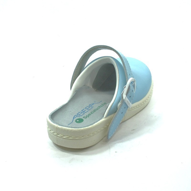 Sabot de confort en cuir bleu ciel non-perforé, équipé d'une bride arrière réglable et pivotante et d'une semelle antidérapante et anti-statique, à motif croix et cercle. Ce sabot est idéal pour les infirmières et présente divers atouts :