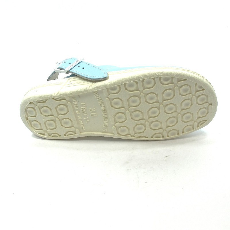 Le sabot de bloc pour infirmière en cuir bleu ciel avec semelle blanche propose un confort hors norme et une légèreté extrême. Sa semelle intérieure est entièrement composée en cuir, elle est antidérapante et résiste à l'huile, au carburant et aux graisses animales. Ce sabot pour infirmière en cuir dispose d'une bride arrière réglable et pivotante afin de s'adapter à vos critères de confort au porter. La semelle de ce sabot pour infirmière bénéficie du traitement Sanitized vous assurant une propreté irréprochable, et sa sécurité est certifiée. Les boucles de ce sabot sont bien entendu sans nickel et elles sont protégées contre la corrosion. Avec son motif croix/cercle, la semelle est garantie antidérapante selon la norme EN ISO 20347:2012, vous assurant sécurité au travail. Ce sabot de travail est idéal pour les infirmières et vous permettra de travailler dans les meilleures conditions possibles. Ce sabot est également facile d'entretien. Excellent rapport qualité/prix sur ce sabot de bloc bleu pour infirmière. Ce sabot de bloc est idéal pour les infirmiers, les infirmières, et pour tous les professionnels du médical !