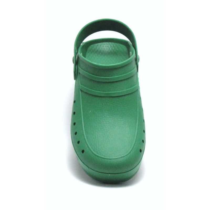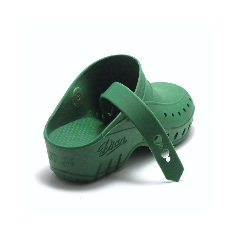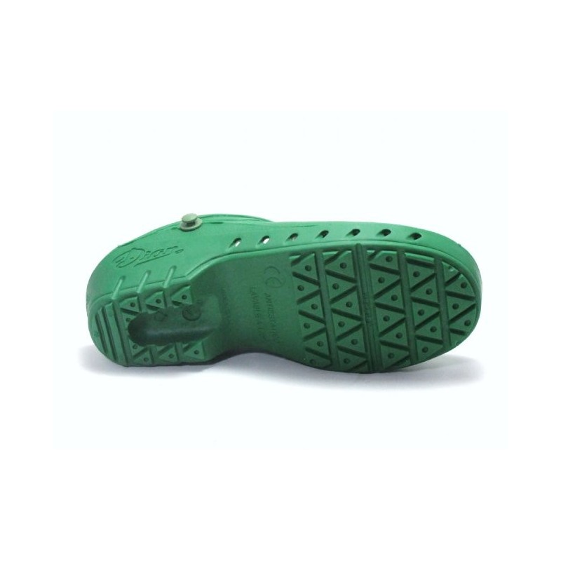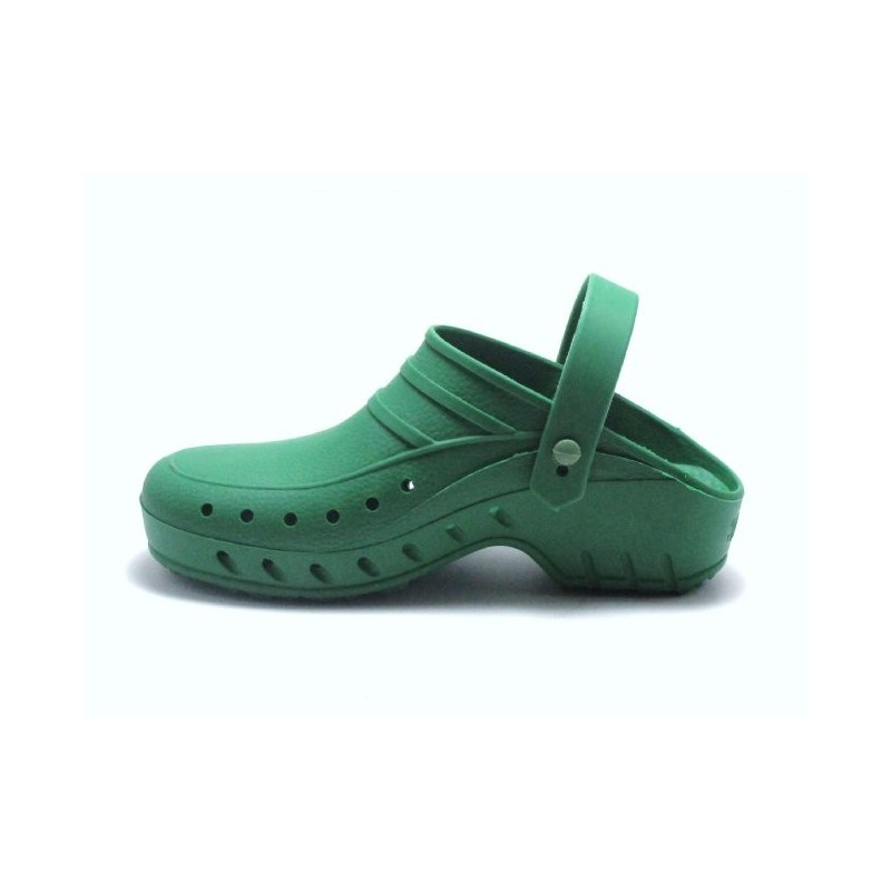 Ce sabot de bloc vert autoclavable est perforé dans la partie basse et moyenne afin de faciliter le lavage et l'aération de votre pied. Il n'y a pas de perforations sur la partie supérieure de l'empeigne de ce sabot de bloc opératoire pour diminuer la pénétration de liquides ou polluants dans le sabot. Ce sabot de bloc opératoire vert est équipé d'une bride rabattable avec la possibilité de la déplacer sur l'empeigne ou au talon du pied. Cela permet en outre d'offrir la possibilité de régler l'ajustement au talon du pied ou d'enlever totalement la bride en la dégrafant des supports de l'empeigne. La semelle de ce sabot de bloc autoclavable est antidérapante avec des nervures pour faciliter l'évacuation des liquides, évitant ainsi le glissement sur des surfaces sales du bloc opératoire. La semelle présente une fente pour faciliter la flexion en augmentant le confort et en diminuant le possible risque d'écorchure dans l'empeigne, causé par une résistance excessive de la semelle à la flexion. Bien entendu c'est un produit pour femme et homme. Peu cher, ce sabot de bloc opératoire vert est léger et confortable ce qui en fait un produit de choix pour profession médicale tels que chirurgien !