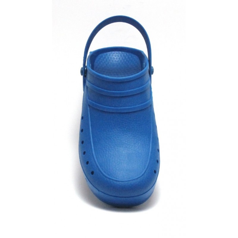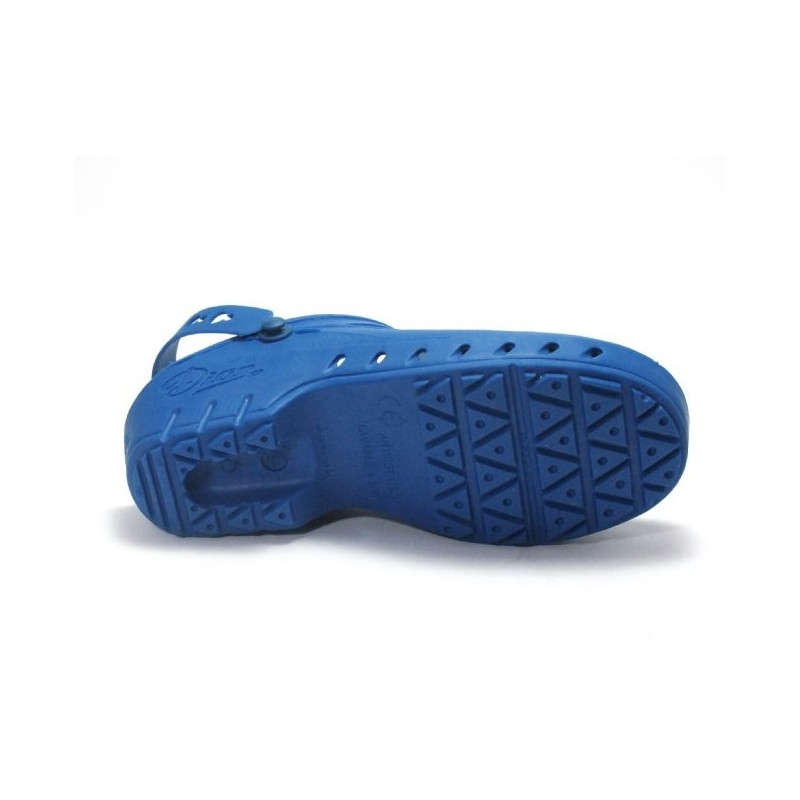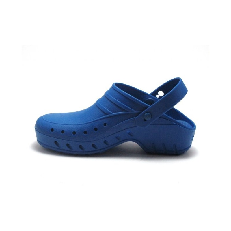 Cette chaussure de bloc confortable bleu est perforée dans la partie basse et moyenne afin de faciliter le lavage et l'aération de votre pied. Il n'y a pas de perforations sur la partie supérieure de l'empeigne de ce sabot de bloc opératoire pour diminuer la pénétration de liquides ou polluants dans le sabot. Cette chaussure de bloc opératoire bleu est équipé d'une bride rabattable avec la possibilité de la déplacer sur l'empeigne ou au talon du pied. Cela permet en outre d'offrir la possibilité de régler l'ajustement au talon du pied ou d'enlever totalement la bride en la dégrafant des supports de l'empeigne. La semelle de cette chaussure de bloc autoclavable est antidérapante avec des nervures pour faciliter l'évacuation des liquides, évitant ainsi le glissement sur des surfaces sales du bloc opératoire. La semelle présente une fente pour faciliter la flexion en augmentant le confort et en diminuant le possible risque d'écorchure dans l'empeigne, causé par une résistance excessive de la semelle à la flexion. Bien entendu c'est un produit utilisable aussi bien pour femme et homme. Pas cher, cette chaussure de bloc opératoire est léger et confortable ce qui en fait un produit de choix pour les professions médicales tels que les chirurgiens !