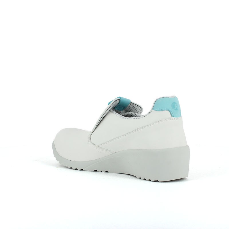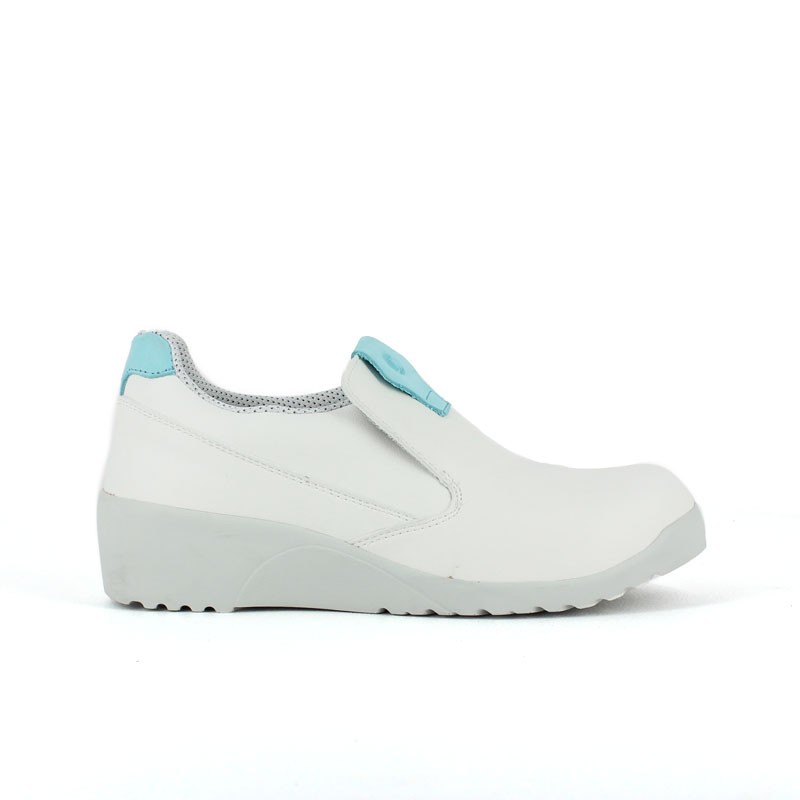 Chaussure de cuisine femme anti-dérapante de couleur blanche. Cette chaussure de cuisine femme à talon est idéale pour la cuisine ou le service en salle. Elle est composée de toutes les bonnes caracteristiques d'une bonne chaussure de sécurité cuisine femme :